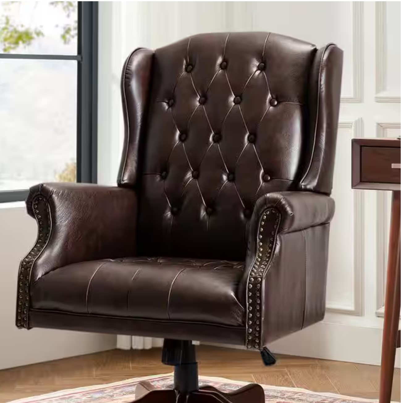 Elegant tufted wingback design: Classic tufted button accents paired with a wingback silhouette and integrated rolled arms deliver timeless executive style